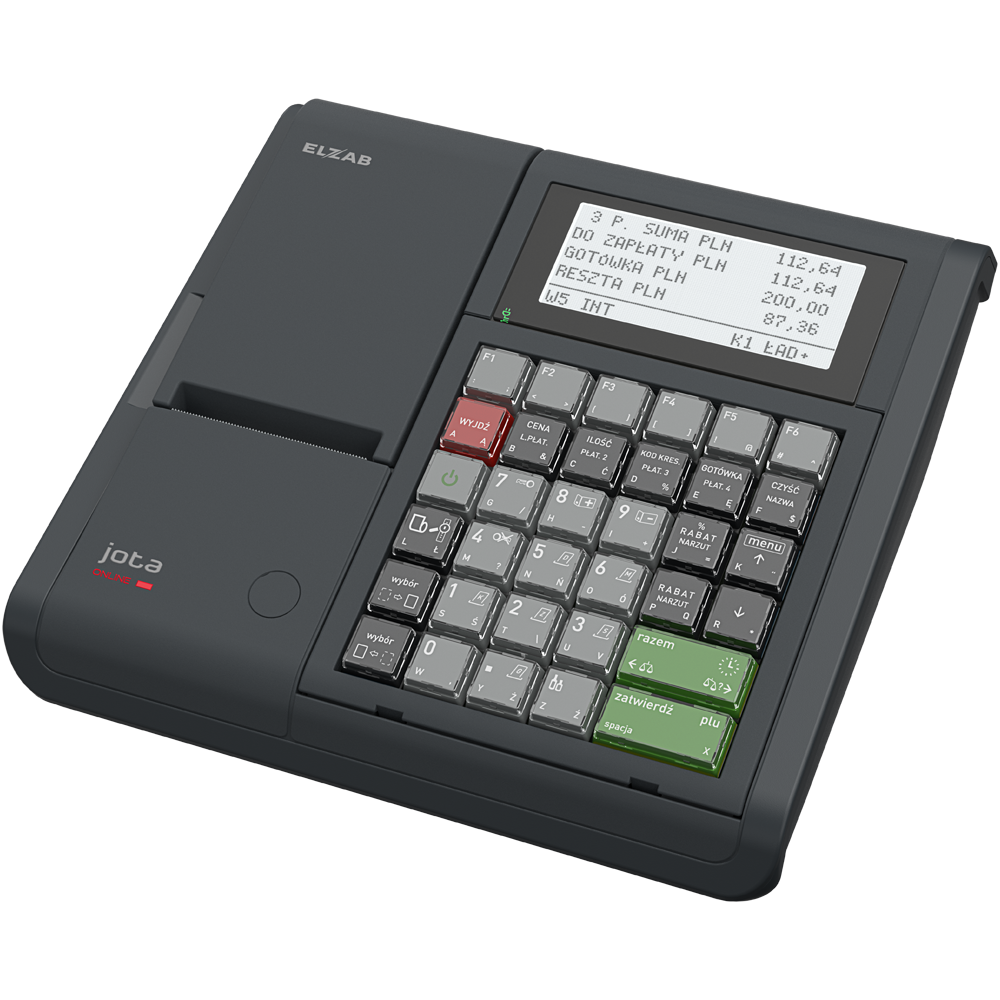 Kasa ELZAB Jota ONLINE to niezawodna kasa fiskalna wyposażona w trwałą klawiaturę mechaniczną oraz 4-liniowy wyświetlacz kasjera. Konstrukcja oparta o sprawdzone, zaawansowane rozwiązania systemowe modelu ELZAB Jota z kopią elektroniczną. Przeznaczona do pracy w sklepach spożywczych, mięsnych, cukierniach, piekarniach, małej gastronomii, szczególnie tam, gdzie możliwa jest praca w sieci LAN/WAN. Posiada podtrzymanie akumulatorowe, może również pracować zasilana z gniazdka zapalniczki samochodowej.